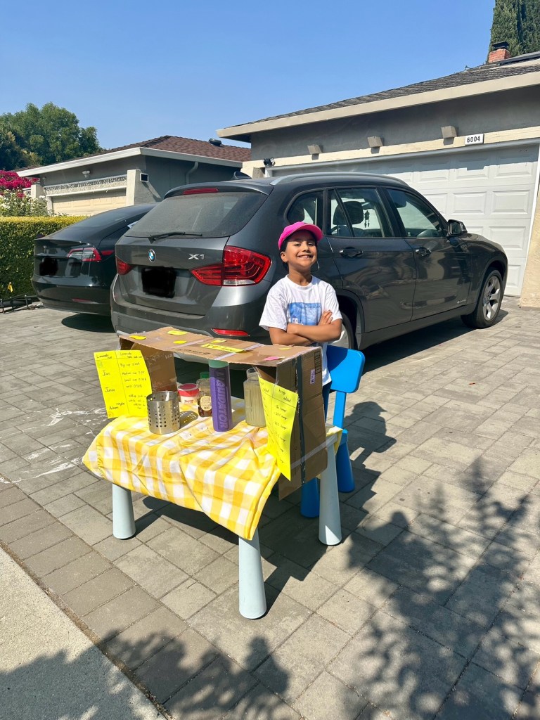 My name is Junia and this is the first time I am making a lemonade stand in my front yard! First I made it, and I hardly got any help by my parents. It was really hard to make it but it was also really fun. I used a table for the table part but for the shady part on top of the table I used cardboard and colored paper. And at the very top I drew some lemons and lemonade pictures. And for decorations I put a table cloth and a lemonade menu. And after that it was ready to be tasted so I gave some to my family and they said they liked it so we asked my parents if we could bring it outside for sale but they kept saying no because they were busy. So we waited for a few days for them to let us and soon they did! So we took the stand outside and brought all the ingredients. And after that we waited for a customer to come. And soon someone came with their kid to drink some lemonade. So we gave him some and we got 1 dollar then my neighbor came over to drink some lemonade and we got 2 dollars then it started to get really hot so my parents got some quickly and gave us 10 dollars. And then we bought the lemonade stand back inside cause it was really hot outside. And in total money we got 12 dollars! And that is the story of day 1 lemonade stand!